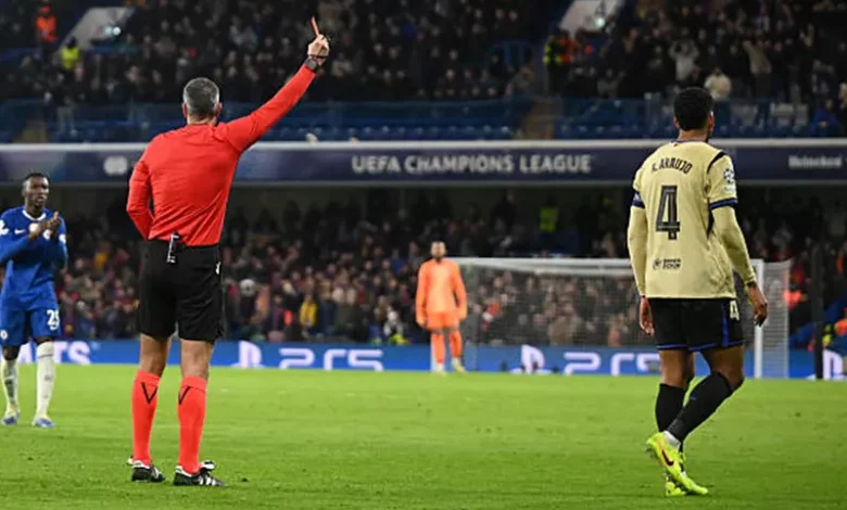 وتلقى رونالد أراوخو، البطاقة الحمراء التي سبقتها أخرى باللون الأصفر، عقب تدخله على مارك كوكوريلا، لاعب تشيلسي.