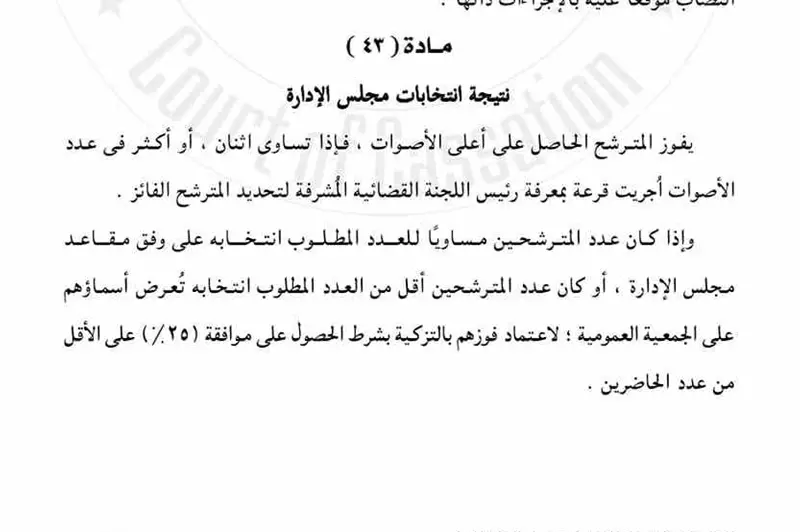 إذا كان عدد المترشحين أقل من العدد المطلوب انتخابه، يتم عرض أسمائهم على الجمعية العمومية لاعتماد فوزهم بالتزكية، بشرط الحصول على موافقة (25%) على الأقل من عدد الحاضرين.