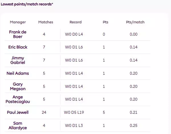 ويبلغ متوسط نقاطه 0.2 نقطة لكل مباراة، وهو رابع أسوأ معدل بالتساوي مع سام ألاردايس، لكنه لا يزال أفضل قليلًا من المعدل الصفري الذي حققه فرانك دي بور خلال مبارياته الأربع مع كريستال بالاس في أغسطس وسبتمبر 2017.