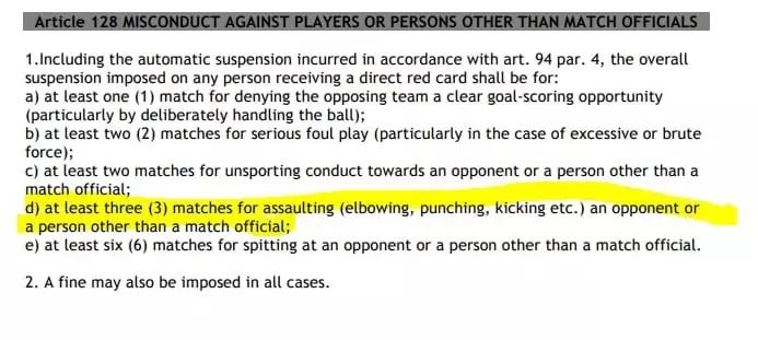 وتنص لائحة الاتحاد الأفريقي، على أنه حال طرد اللاعب بسبب اعتدائه على منافسه بالكوع أو بالركل، فإنه سيتم إيقافه لمدة لا تقل عن ثلاث مباريات.